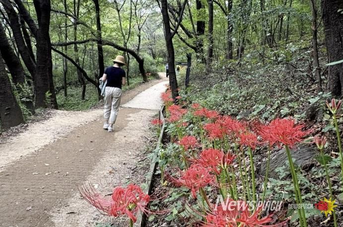 뉴스펀치 김완규 기자 | 서대문구는 관내 안산(鞍山) 자락길에 가을의 전령사인 꽃무릇이 활짝 피어 등산객들의 눈길을 사로잡고 있다고 2일 밝혔다.
