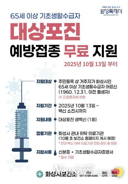 뉴스펀치 탁상훈 기자 | 화성특례시가 오는 13일부터 65세 이상 기초생활수급자 어르신들의 건강 증진과 의료비 부담 완화를 위해 대상포진 예방접종 비용을 전액 지원한다고 2일 밝혔다.