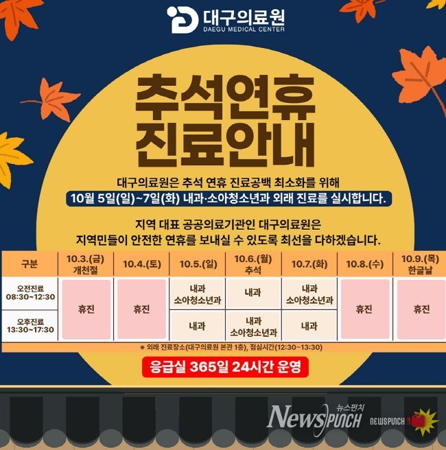 뉴스펀치 조평훈 기자 | 대구의료원이 추석 연휴 기간(10.3.~10.9.) 응급실 운영을 강화하고, 10월 5일(일)부터 7일(화)까지 내과·소아청소년과 외래 진료를 실시한다.