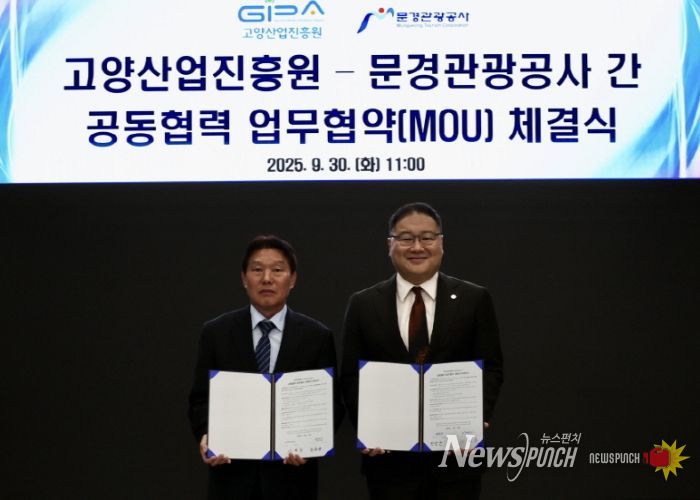 뉴스펀치 탁상훈 기자 | 고양산업진흥원이 지난 30일, 고양아쿠아특수촬영스튜디오에서 문경관광공사와 공동협력 업무협약 MOU를 체결했다.