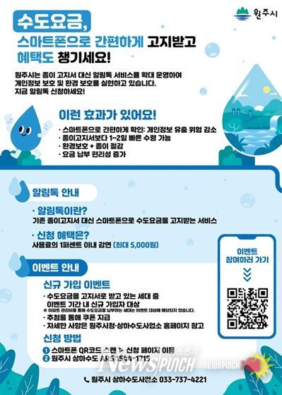 뉴스펀치 김길룡 기자 | 원주시상하수도사업소는 ‘수도요금 알림톡 서비스’ 확대를 위해 10월 1일부터 12월 7일까지 신규 가입 이벤트를 진행한다.