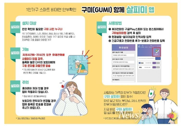 뉴스펀치 김길룡 기자 | 구미시는 긴 추석 연휴를 맞아 시민과 방문객이 함께 참여하는 안전망 강화 홍보에 나선다. 특히, 1인 가구, 독거노인 등 돌봄이 필요한 가족과 이웃 등의 안전을 확인할 수 있는 '구미함께 살피미 앱'을 적극 홍보하며 따뜻하고 안전한 명절 만들기에 힘쓸 계획이다.
