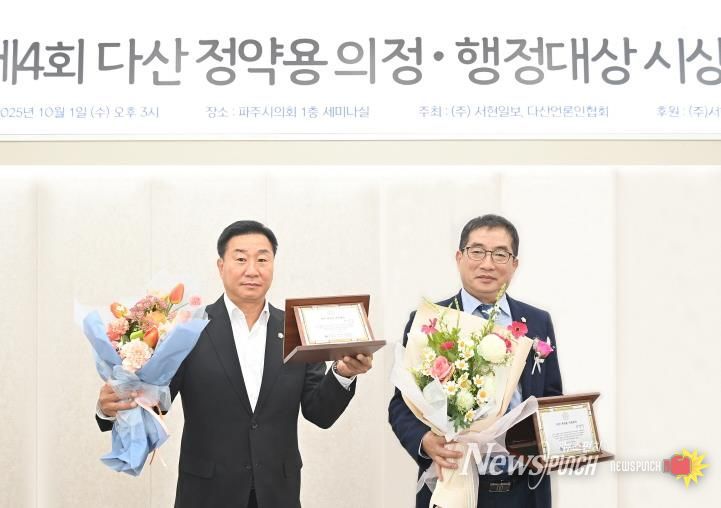 뉴스펀치 탁상훈 기자 | 파주시의회 박대성 의장, 손형배 의원은 10월 1일 파주시의회에서 열린 제4회 다산 정약용 의정·행정대상에 기초의원 부문 대상을 수상했다. 또한 파주를 지역구로 둔 경기도의회 이한국 도의원도 광역의원 부문에 함께 수상되어 의미를 더했다.