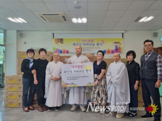 뉴스펀치 김길룡 기자 | 법보종찰 해인사와 조계종 사회복지재단 산하 코끼리행복복지센터는 10월 1일 봉산면, 묘산면, 가야면, 야로면의 노인맞춤돌봄서비스 대상자 어르신 800가구에 송편과 과일을 담은 선물 상자를 전달하는 ‘추석맞이 행복나눔 행사’를 진행했다.