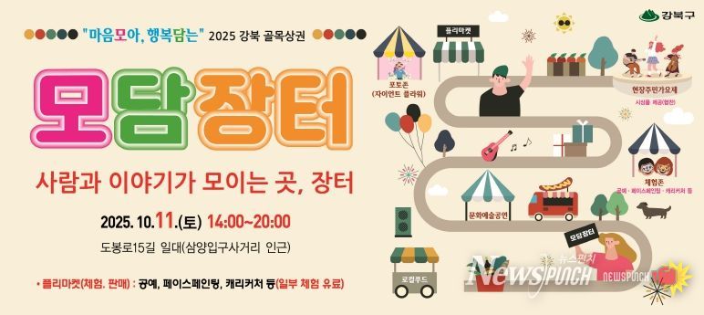 뉴스펀치 김완규 기자 | 서울 강북구는 오는 11일 오후 2시부터 8시까지 삼양입구사거리 인근 도봉로15길 일대에서 ‘2025 강북 골목상권 모담장터’를 개최한다고 밝혔다.