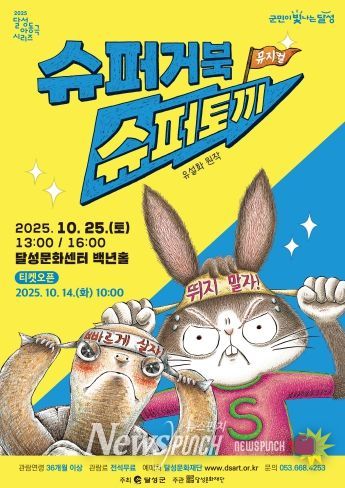 뉴스펀치 조평훈 기자 | 달성문화재단은 오는 25일 오후 1시와 4시, 달성문화센터 백년홀에서 ‘2025 달성 아동극 시리즈’의 다섯 번째 공연 ‘슈퍼거북 슈퍼토끼’를 개최한다고 밝혔다.