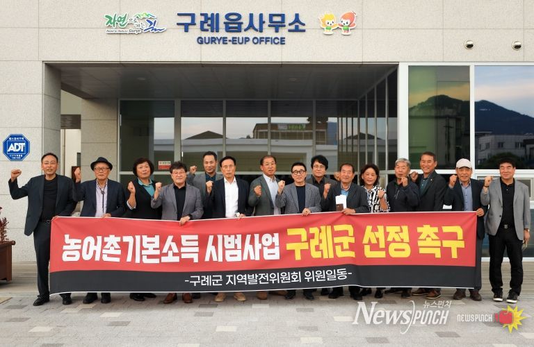 뉴스펀치 김길룡 기자 | 전남 구례군지역발전위원회(위원장 장석우)는 지난 1일 구례읍사무소에서 정부가 추진하는 농어촌기본소득 시범사업 대상지로 구례군을 선정할 것을 강력히 촉구했다.
