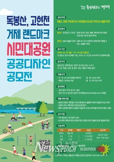 뉴스펀치 김길룡 기자 | 거제시는 독봉산·고현천 일대 랜드마크 시민대공원 조성사업의 관심과 공감대를 형성하고, 다양한 아이디어를 반영하기 위하여 독봉산·고현천 거제 랜드마크 시민대공원 공공디자인 공모전을 개최한다.