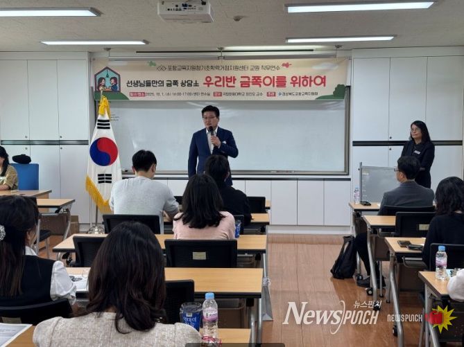 뉴스펀치 김길룡 기자 | 포항교육지원청기초학력거점지원센터는 10월 1일 14:00 포항기초학력거점지원센터 4층 연수실에서 정서적 문제로 인해 학습 부진이 누적되고 있는 학생 지도에 어려움을 겪고 있는 포항지역 초등교사 40명을 대상으로 2025 포항교육지원청기초학력거점지원센터 교원 직무연수를 실시했다.