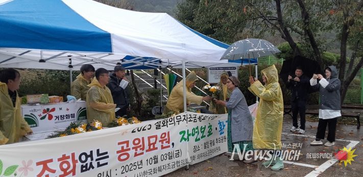 뉴스펀치 김길룡 기자 | 함양군은 추석 연휴 첫날인 3일 공설추모공원에서 성묘객을 대상으로 ‘플라스틱 조화 근절 행사’를 열고 친환경 추모 문화 확산에 나섰다고 밝혔다.