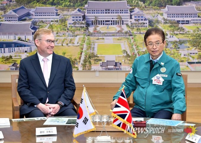 뉴스펀치 김길룡 기자 | 이철우 경상북도지사는 3일 도청을 방문한 콜린 크룩스(Colin Crooks) 주한 영국대사 내외와 만나, 경주 APEC 정상회의의 성공적 개최 협력 방안과 함께 산업·문화·교육 등 다양한 분야의 교류 확대를 논의했다.