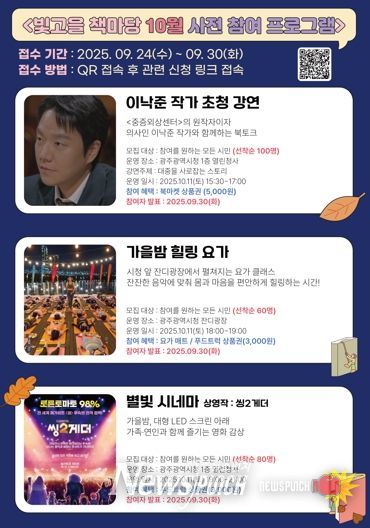 한편 ‘빛고을 책마당’ 일부 프로그램은 사전 예약제로 운영되며, 광주문화예술통합플랫폼 ‘디어마이광주’를 통해 신청 가능하다. 자세한 사항은 광주시 문화유산자원과로 문의하면 된다.