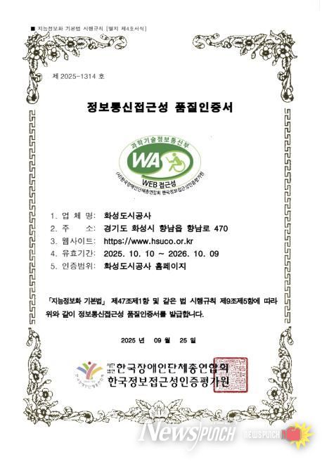 뉴스펀치 탁상훈 기자 | 화성도시공사는 시각장애인, 고령자 등 정보 취약계층도 불편 없이 홈페이지를 이용할 수 있도록 지속적으로 개선해온 결과, 3년 연속 ‘웹 접근성 품질인증마크’를 획득했다고 10일 밝혔다.