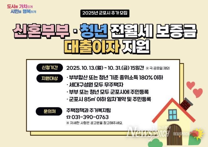 뉴스펀치 탁상훈 기자 | 군포시는 신혼부부와 청년들의 주거비 부담 경감과 안정적인 거주환경을 위해 추진 중인 ‘군포시 신혼부부 및 청년 전월세 보증금 대출이자 지원사업’의 지원 기준을 대폭 완화하고 이에 따라 추가 지원 대상자를 모집한다고 밝혔다.