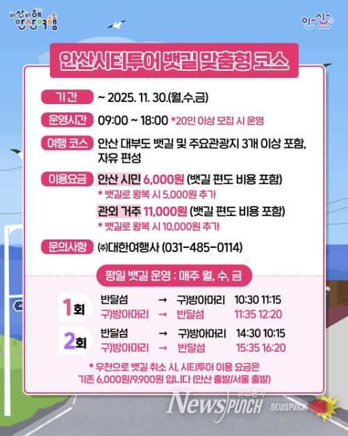 뉴스펀치 탁상훈 기자 | 안산시는 오는 11월 30일까지 안산시티투어와 안산-대부도 뱃길 사업을 연계한 ‘안산시티투어 뱃길 맞춤형 코스’ 특별이벤트를 운영한다고 10일 밝혔다.