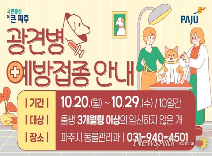 뉴스펀치 탁상훈 기자 | 파주시는 반려견을 동반한 야외활동이 잦아지는 가을을 맞아 오는 20일부터 29일까지 생후 3개월 이상의 임신하지 않은 개를 대상으로 광견병 예방접종을 실시한다고 밝혔다.