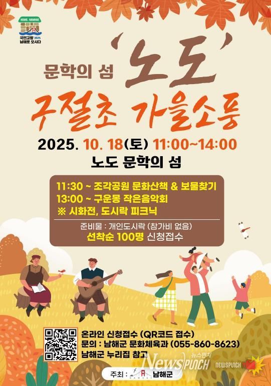 뉴스펀치 김길룡 기자 | 남해군은 오는 10월 18일 오전 11시부터 오후 2시까지 문학의 섬 ‘노도’에서 ‘노도 구절초 가을소풍’ 행사를 개최한다.