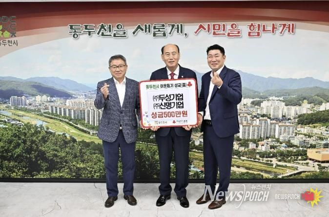 뉴스펀치 탁상훈 기자 | ㈜두성기업과 ㈜신명기업은 추석 명절을 맞아 지난 10월 1일 동두천시청을 방문, 저소득 가정을 지원하기 위해 각각 250만 원씩 총 500만 원을 기탁했다.