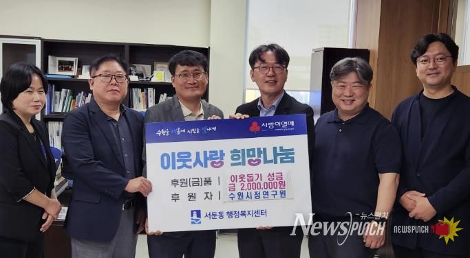 뉴스펀치 탁상훈 기자 | 수원시정연구원과 수원시정연구원 사우회가 지난 10월 2일, 추석을 맞아 나눔을 실천하고자 성금 200만원을 서둔동 행정복지센터에 기탁했다. 이번 기탁금은 수원시정연구원장과 수원시정연구원 사우회에서 각 100만원을 모아 마련한 것이다.