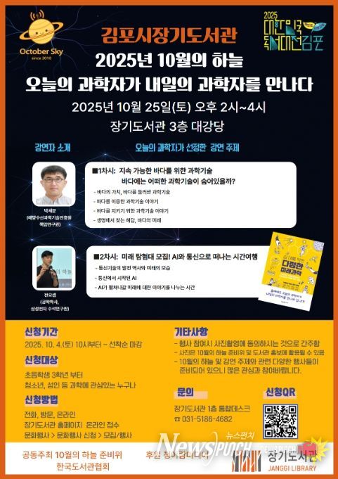 뉴스펀치 탁상훈 기자 | 김포시 장기도서관은 10월 25일 오후 2시부터 4시까지 3층 대강당에서 김포시민을 대상으로 과학자들의 재능기부 도서관 과학 강연 '10월의 하늘: 오늘의 과학자가 내일의 과학자를 만나다'를 운영한다.