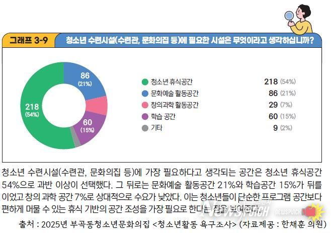 부곡동청소년문화의집 응답 청소년의 절반 이상인 54%는 청소년 전용 휴식공간이 필요하다고 답했고, 포일 청소년문화의집 조사 역시 가장 필요한 공간으로 휴식공간을 1순위(36%)로 꼽았다.