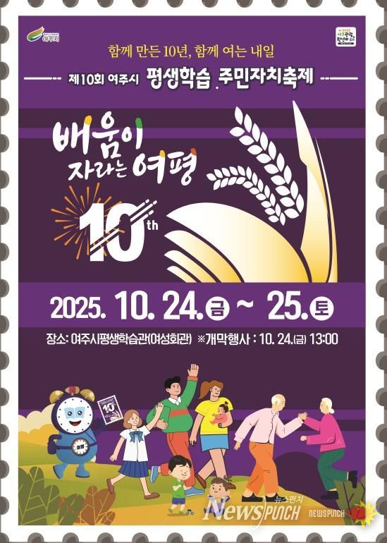 뉴스펀치 탁상훈 기자 | 여주시는 오는 10월 24일부터 25일까지 이틀간 여주시평생학습관 일원에서 '제10회 여주시 평생학습·주민자치축제'를 개최한다. '배움이 자라는 여평 – 함께 만든 10년, 함께 여는 내일'을 주제로 열리는 이번 축제는 평생학습도시 여주시가 지난 10년간 시민과 함께 쌓아온 학습의 성과를 나누고, 앞으로의 10년을 새롭게 열어가는 의미 있는 자리로 마련됐다.