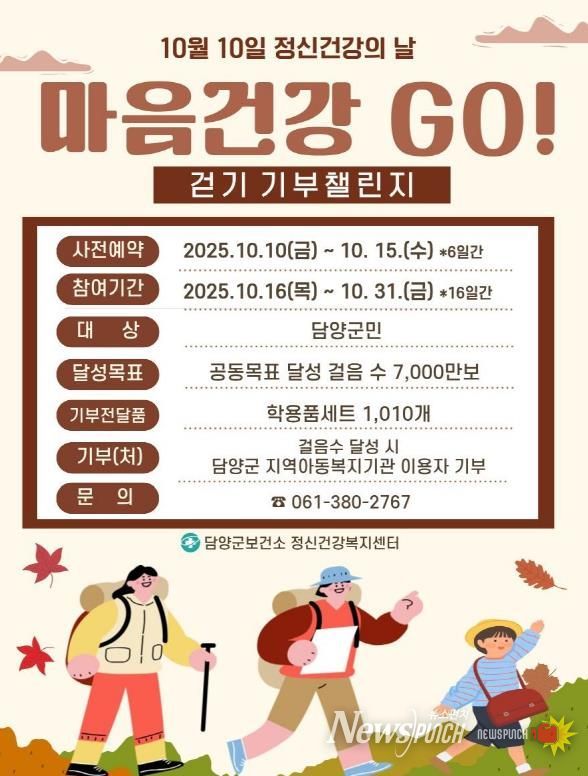 뉴스펀치 김길룡 기자 | 담양군은 10월 10일 ‘세계 정신건강의 날’을 맞이하여 전 군민을 대상으로 걷기 기부 챌린지를 운영한다고 밝혔다.