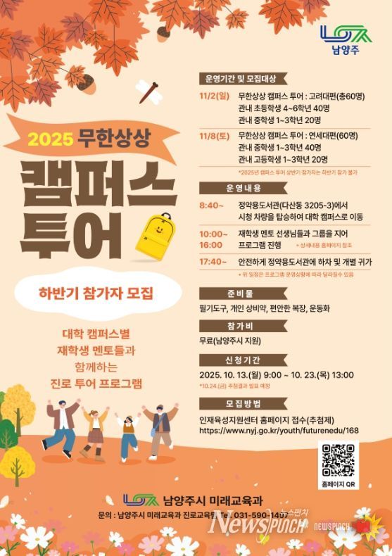 뉴스펀치 탁상훈 기자 | 남양주시는 10월 13일부터 10월 23일까지 관내 초등학교 4학년부터 고등학교 3학년을 대상으로 ‘무한상상 캠퍼스 투어’ 참가자를 모집한다.