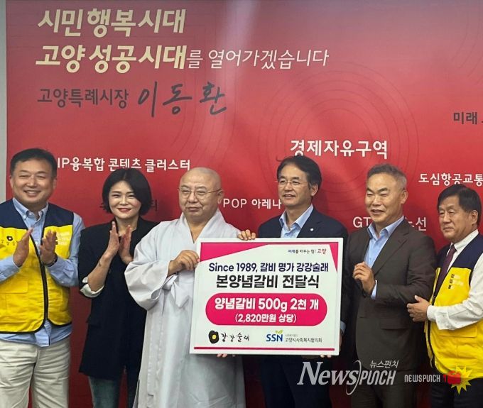 뉴스펀치 탁상훈 기자 | ㈜전한의 외식브랜드 강강술래(대표 노상환)가 10월 10일, 고양특례시에 본양념갈비 500g 2,000개(2,820만 원 상당)를 기탁했다. 이번 전달식은 고양특례시청 열린시장실에서 진행됐으며, 이동환 고양특례시장, 김민숙 고양특례시의원(고양, 관산, 원신), 노상환 강강술래 대표, 김응화 고양시사회복지협의회 회장이 함께 자리했다.
