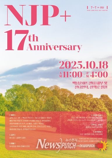 뉴스펀치 탁상훈 기자 | 경기문화재단 백남준아트센터(NJP, 관장 박남희)는 2025년 10월 18일, 개관 17주년 기념 축제 'NJP+'를 연다. 특히 이번 행사는 백남준아트센터와 경기도박물관, 경기도어린이박물관으로 이어지는 산책로 환경개선과 맞물려 축하의 의미를 더하고 있다. 아트센터는 올해 시민 예술 교육프로그램인 ‘퍼블릭 아카데미’ 운영, 지역 연계 협력 축제인 ‘제8회 머내마을영화제’ 공동체 상영관 참여, 유휴부지에 공유 정원을 조성하는 ‘이키로(2km) 정원행동 캠페인’ 등 지역과 환경을 잇는 새로운 고객서비스 프로그램을 기획·추진하고 있다.