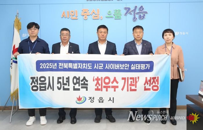 뉴스펀치 정홍균 기자 | 정읍시가 전북특별자치도 주관 ‘2025년 시·군 사이버 보안 실태평가’에서 5년 연속 최우수기관으로 선정되는 쾌거를 이뤘다. 갈수록 고도화·다변화하는 사이버 위협 환경 속에서 거둔 성과여서 그 의미가 더욱 크다는 평가다.
