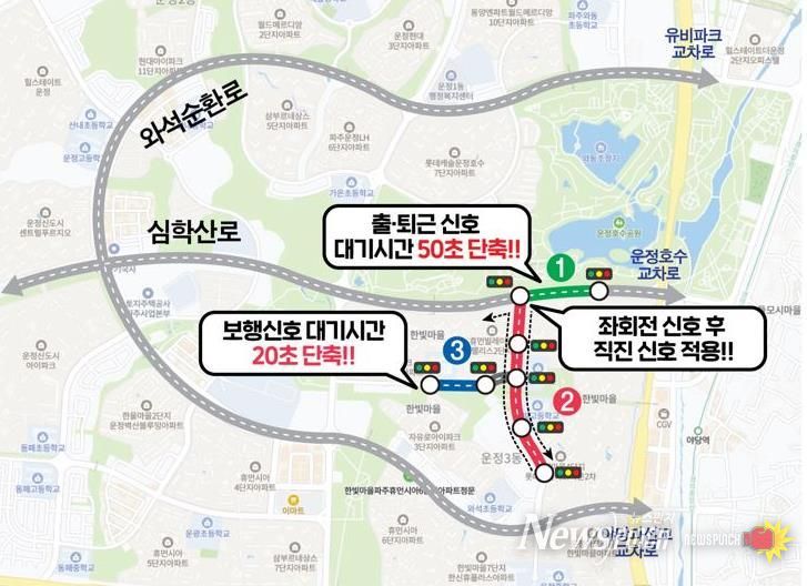 뉴스펀치 탁상훈 기자 | 파주시는 출퇴근 시간대에 신호주기가 길어 불편했던 운정 한빛마을 5단지 및 2·5단지 소도로 일대 구간의 신호체계를 우선적으로 개선했다고 밝혔다.