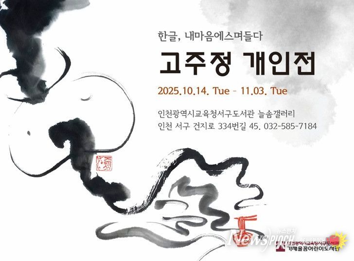 뉴스펀치 탁상훈 기자 | 인천광역시교육청서구도서관은 10월 14일부터 11월 3일까지 늘솜갤러리에서 고주정 작가의 현대캘리그라피 전시 ‘한글, 내 안에 스며들다’를 운영한다.