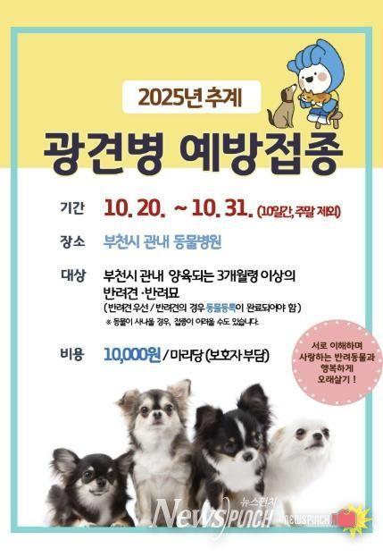 뉴스펀치 탁상훈 기자 | 부천시는 10월 20일부터 31일까지 토요일과 일요일을 제외한 평일에 관내 동물병원 71곳에서 ‘추계 광견병 예방접종’을 실시한다.