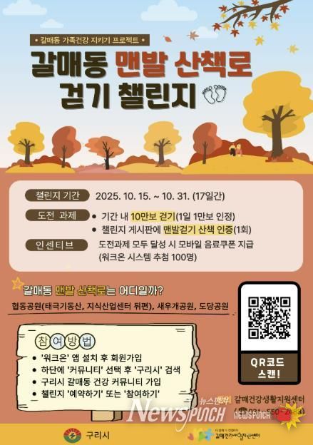 뉴스펀치 탁상훈 기자 | 구리시는 가을철 주민들의 건강한 생활 습관 형성과 스트레스 완화를 위해 ‘갈매동 맨발 산책로 걷기 챌린지’를 오는 10월 15일부터 31일까지 17일간 운영한다고 밝혔다.
