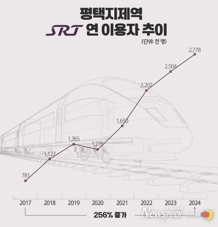 평택지제역은 2016년 개통 당시부터 SRT가 정차한 역사로, 매년 이용객 수가 꾸준히 증가하고 있다. 실제 ‘철도연감’에 따르면 평택지제역의 연간 SRT 승하차 인원은 2017년 78만 1천 명이었지만, 2024년에는 277만 8천 명으로 256%의 증가율을 기록했다. 이러한 증가율은 SRT 역사 중 가장 높은 수치다.