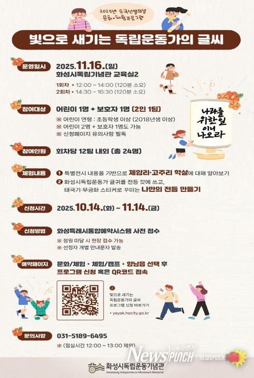 한동민 화성시독립운동기념관장은 “이번 프로그램이 순국선열의 희생과 정신을 직접 체험하며 되새길 수 있는 소중한 기회가 될 것”이라며 “가족이 함께 독립운동의 역사적 의미를 공유하고 평화의 가치를 나누는 시간을 가져보시길 바란다”고 말했다.