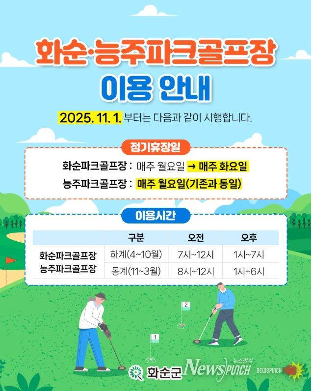 뉴스펀치 김길룡 기자 | 화순군은 13일 파크골프장 운영과 관련하여 ▲정기 휴장일 변경 ▲자매결연 등 협력 지자체 주민 요금 감면 ▲군민 월 사용권 발행이 11월 1일부터 시행된다고 밝혔다.