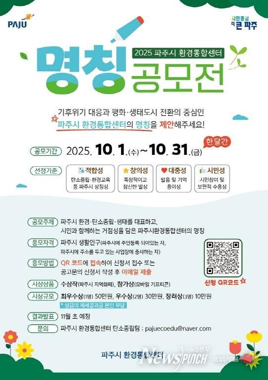 이번 공모전은 시민과 함께하는 탄소중립·환경교육 거점센터로서의 비전과 정체성을 담은 명칭을 선정하기 위해 마련됐으며, 파주시에 거주하거나 파주시 소재 사업장에서 근무하는 시민이면 누구나 참여할 수 있다.