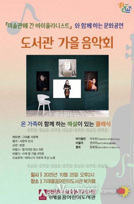 뉴스펀치 탁상훈 기자 | 인천광역시교육청서구도서관은 10월 문화의 달을 맞아 오는 25일 오후 2시부터 3시까지 가재울꿈어린이도서관 1층 북카페에서 ‘도서관 가을 음악회’를 개최한다.
