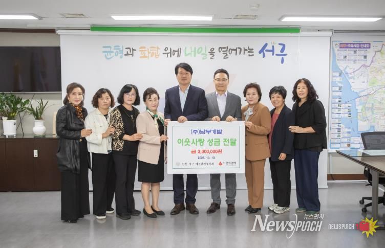 뉴스펀치 탁상훈 기자 | 인천 서구는 ㈜남부개발로부터 이웃사랑 성금 3백만 원을 서구 여성단체협의회를 통해 기탁받아 ‘사랑의 고추장 담그기’ 행사를 개최할 계획이라고 밝혔다.
