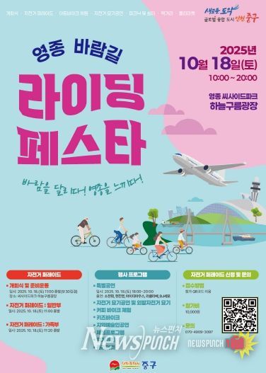 김정헌 중구청장은 “영종국제도시는 바다와 하늘이 만나 뛰어난 풍광을 자랑한다는 점에서 자전거 나들이로 탁월한 명소”라며 “올가을, 많은 시민이 영종 바람길 라이딩 페스타에서 특별한 추억을 쌓길 바란다”라고 밝혔다.