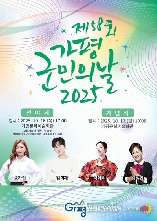 뉴스펀치 탁상훈 기자 | 가평군은 오는 16일 오후 5시, 새롭게 리모델링을 마친 가평문화예술회관에서 ‘제58회 가평군민의 날 전야제’를 개최한다. 이번 행사는 ‘다시, 가평으로’를 슬로건으로 내세워 수해 극복과 지역 재도약을 기원하며 군민 화합의 의미를 담아 열린다.