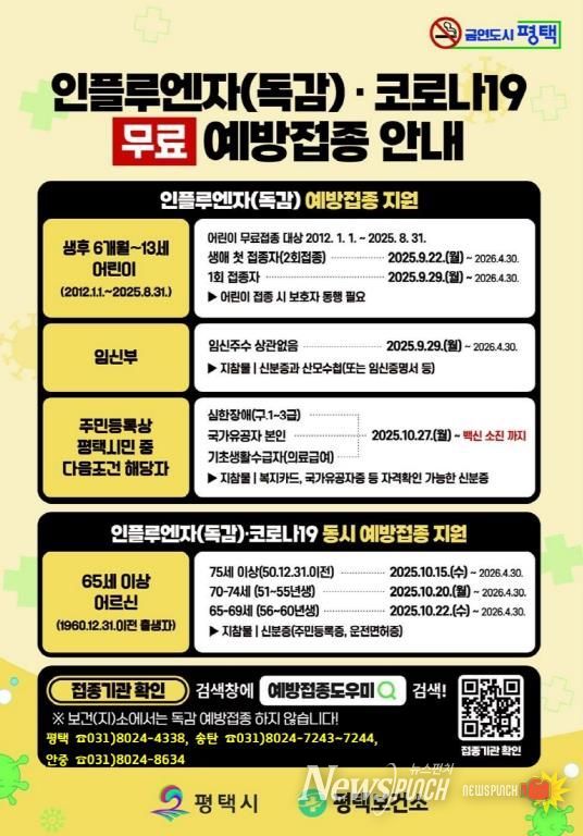 뉴스펀치 탁상훈 기자 | 평택시는 오는 15일부터 2025-2026절기 코로나19 무료 예방접종을 지정 위탁의료기관에서 실시한다고 밝혔다.