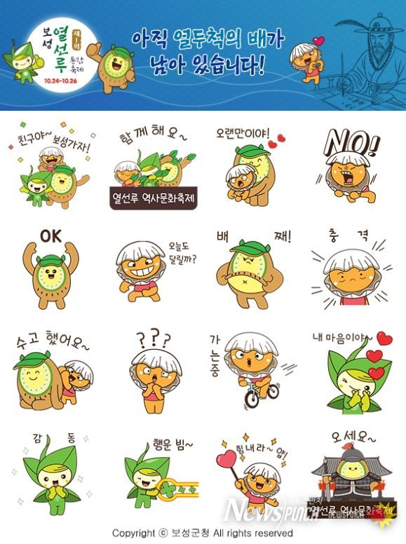 이번 이모티콘 무료 배포는 10월 24일부터 3일 동안 열리는 ‘제1회 보성 열선루 이순신 역사문화축제’를 널리 알리기 위한 것으로, 보성의 대표 특산물인 녹차·꼬막·키위를 의인화한 캐릭터 BS삼총사를 귀엽고 익살스럽게 표현했다.
