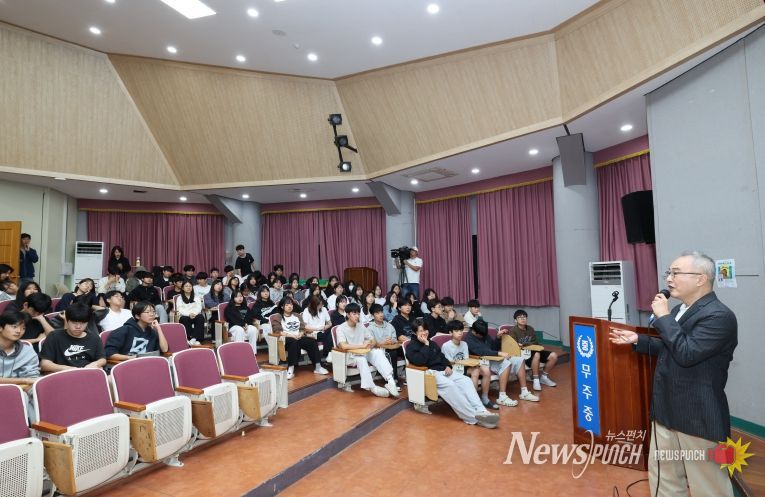 무주중학교 시청각실에서 개최된 이날 행사는 지역 내 학생들의 독서문화를 선도하고 인문학적 소양 증진에 기여하기 위해 마련된 것으로, 2025 무주군 올해의 책으로 선정된 청소년 부문 도서, “인권을 들어 올린 스포츠 선수들”의 저자 최동호 작가가 진행했다.