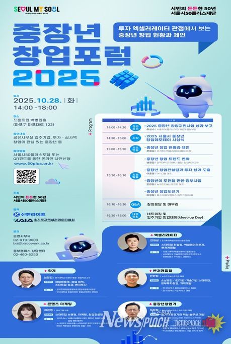 10월 28일 오후 2시, 마포 프론트원 박병원홀에서 열리며 서울시50플러스재단이 추진해 온 중장년 창업컨설팅 지원사업의 주요 성과와 우수사례를 공유하고, 창업 트렌드·정부지원·투자 연계 방안 등을 논의하는 전문가 포럼이 함께 진행될 예정이다.