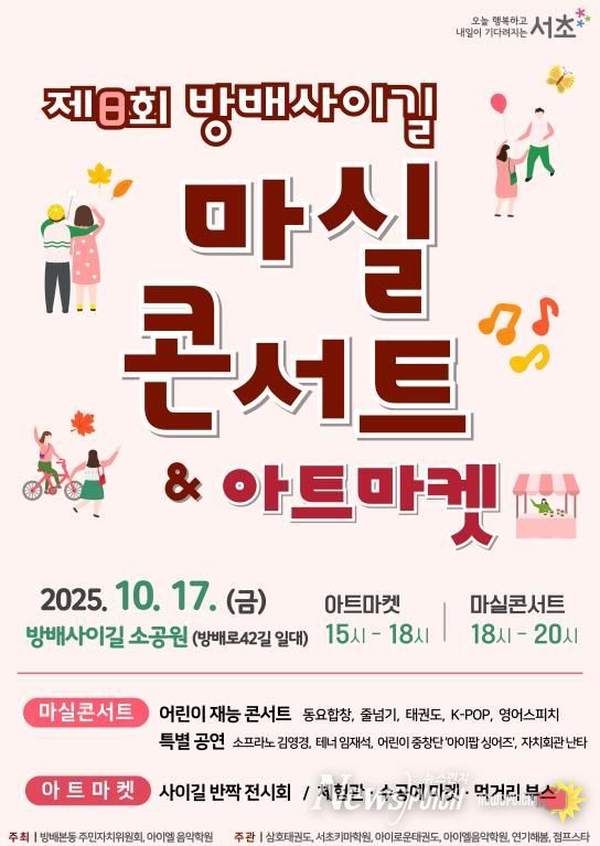 뉴스펀치 김완규 기자 | 서울 서초구는 오는 17일 방배로42길에 위치한 방배사이길 소공원에서 '제8회 방배사이길 마실콘서트·아트마켓'을 개최한다고 밝혔다.