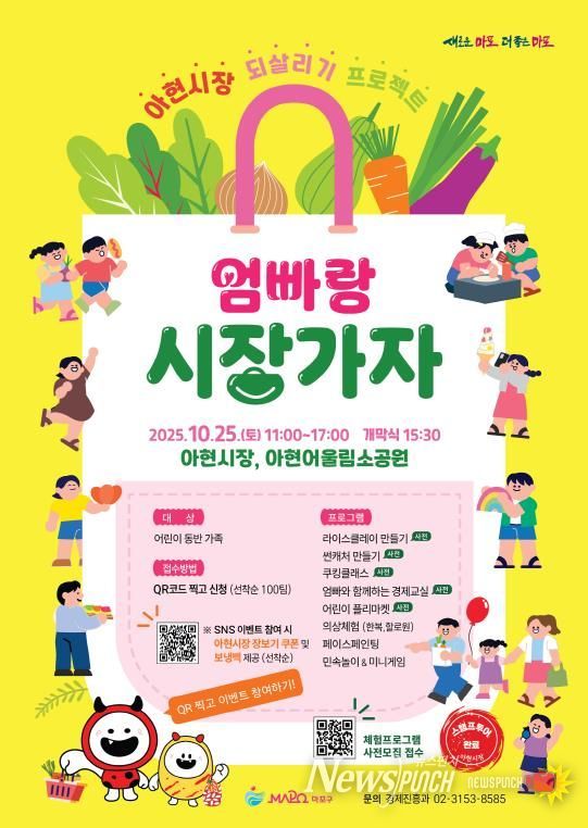 뉴스펀치 김완규 기자 | 마포구는 10월 23일까지 ‘장바구니 속, 추억 한바구니 엄빠랑 시장가자’ 프로그램에 참여할 어린이 동반 가족 100팀을 선착순으로 모집한다.