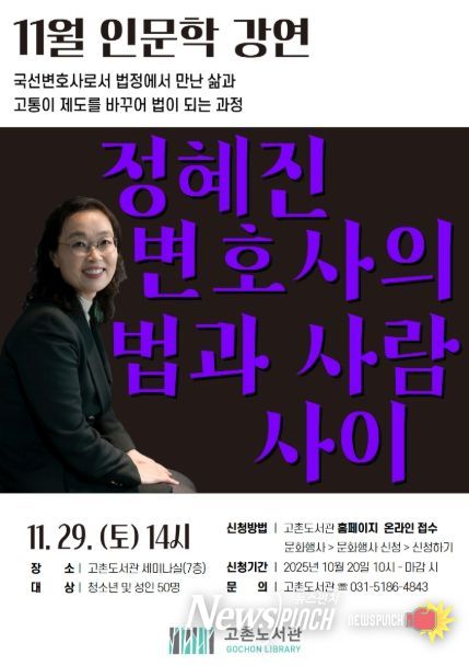뉴스펀치 김길룡 기자 | 김포시 고촌도서관은 오는 11월 29일 오후 2시부터 4시까지 '법과 사람 사이' 강연을 운영한다.